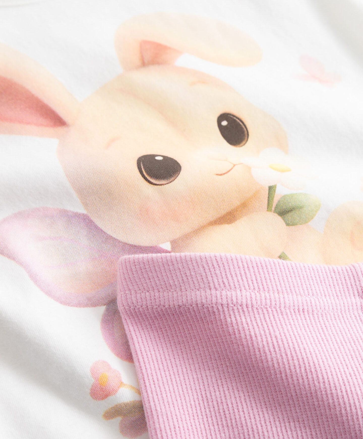 Set za bebe djevojčice sastoji se od majice i biciklističkog šorca. Majica je napravljena od mekanog pamučnog materijala koji je ugodan za osjetljivu kožu, a print zeca na prednjoj strani osvojit će srce svake male ljubiteljice ovih slatkih životinja. Šorc s visokim udjelom pamuka je elastičan i ne ograničava pokret i igru.