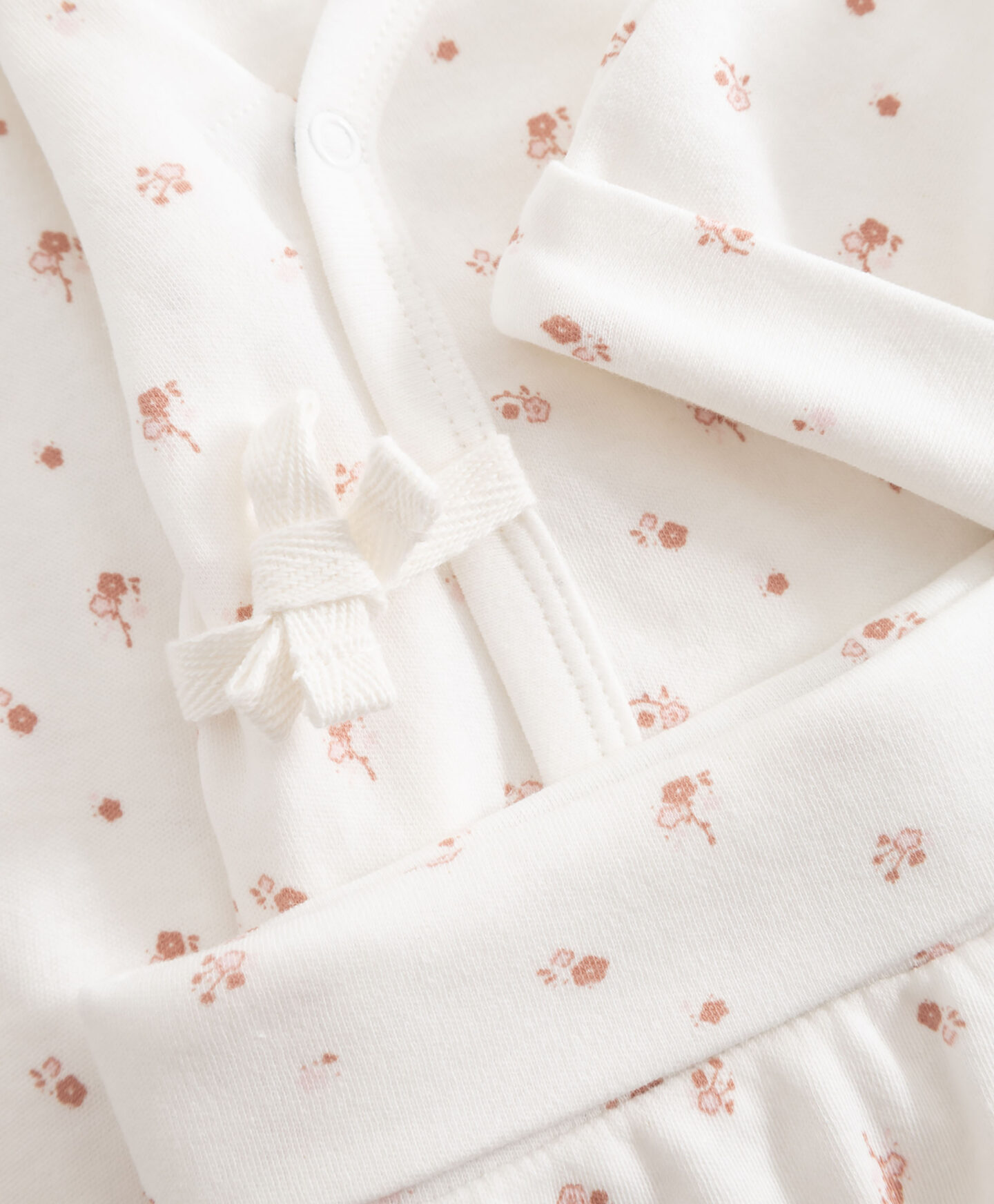 Set za bebe-djevojčice: kardigan, helanke i kapa, napravljen od 100% pamuka, savršen je poklon za najmlađeg člana porodice. Pažljivo je sašiven i predstavlja gotovu kombinaciju za prve sedmice života. Mekani materijal nježno obavija osjetljivu kožu i osigurava udobnost tokom spavanja i bebinih aktivnosti.