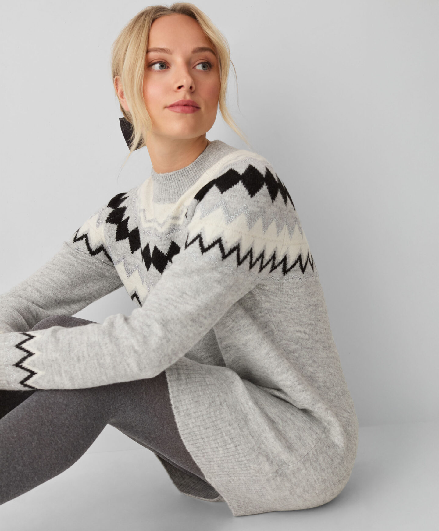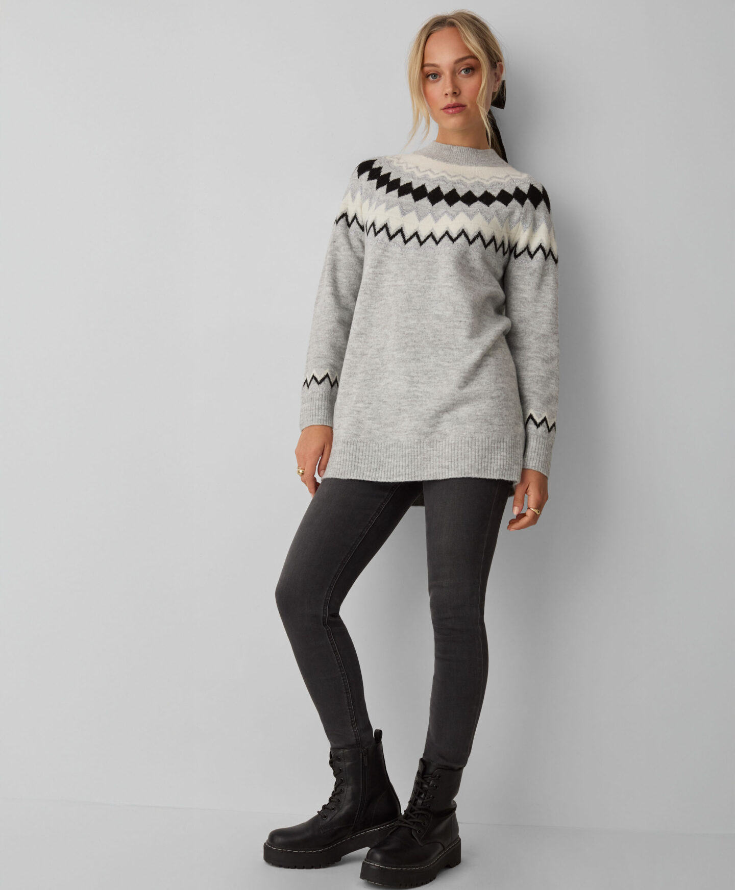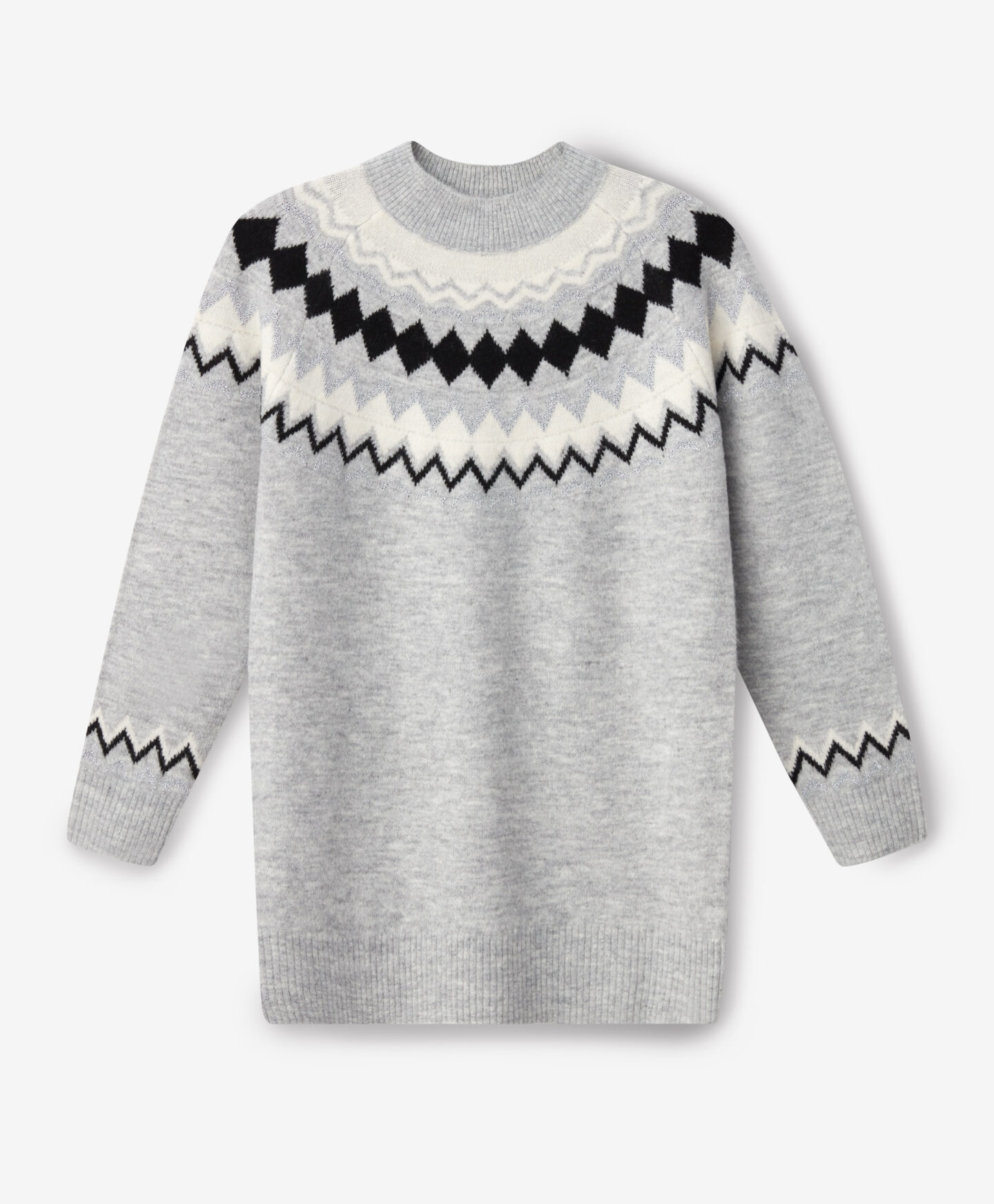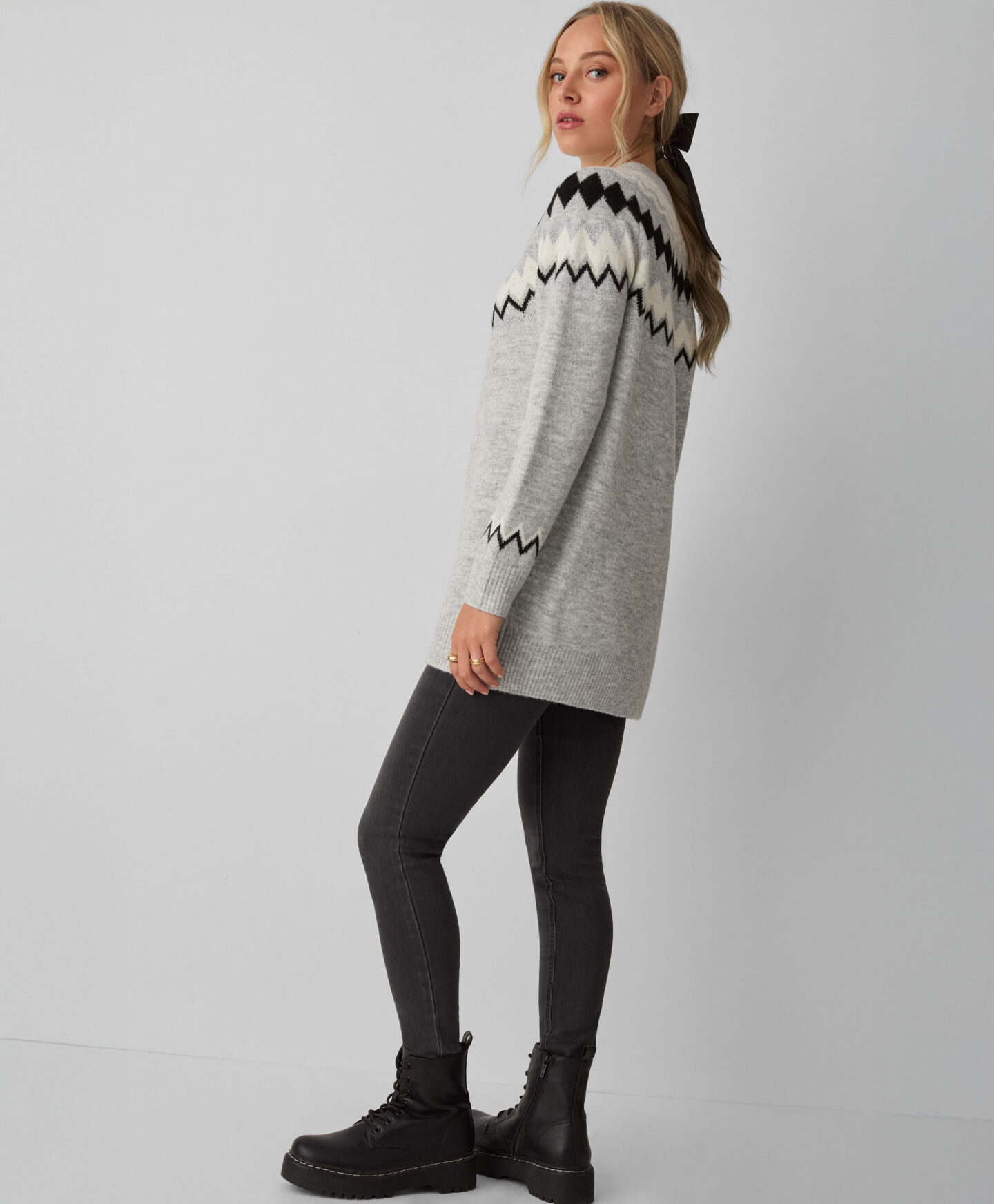 Siva tunika s nordijskim uzorkom za žene savršeno će upotpuniti vašu jesenju garderobu. Duga, topla i elegantna, izgledat će odlično uz helanke ili deblje čarape. U kombinaciji s visokim čizmama ili gležnjericama stvara moderan izgled idealan za šetnju, posao ili druženje s prijateljima.