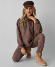 Smeđe antilop hlače s džepovima za žene predstavljaju moderan i udoban izbor za svaki dan. Mekane su, prijatne na dodir i idealne za jesenje šetnje. Prigušena nijansa smeđe savršeno se slaže s duksericom s kapuljačom iz iste kolekcije. U ponudi su dostupni različiti dezeni.