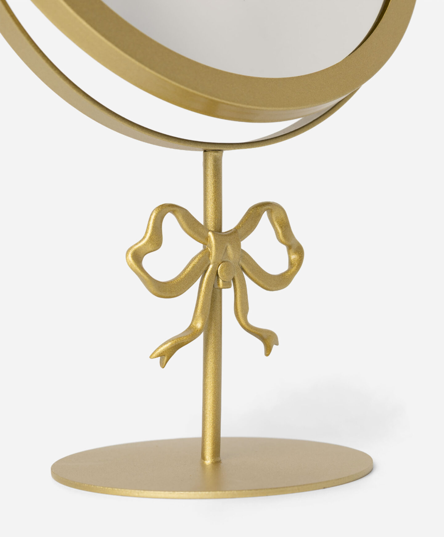 Stojeće ogledalo s mašnom je elegantan dodatak koji će unijeti poseban šarm u vaš interijer. Zlatna završna obrada savršeno se slaže s ukrasnom mašnom, stvarajući sofisticiran i moderan izgled. Idealno je za spavaću sobu, kupatilo ili toaletni sto i olakšat će svakodnevne rituale njege.