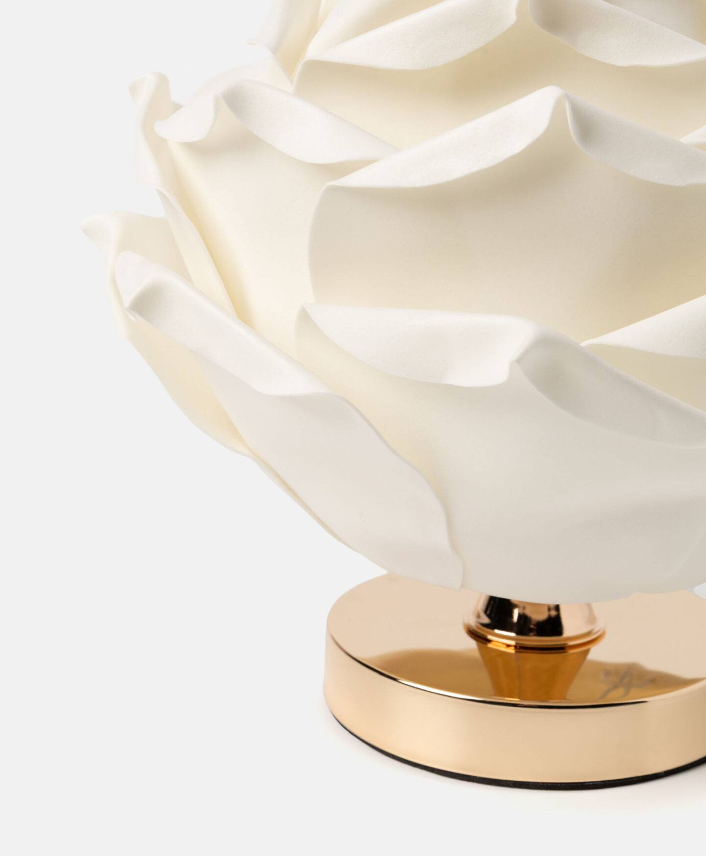 Stolna lampa u obliku cvijeta privlači pažnju svojim jedinstvenim oblikom. Abažur podsjeća na zatvoren pupoljak cvijeta, napravljen od nježnih latica krem boje. Kontrastna zlatna baza daje lampi elegantan karakter koji se uklapa u klasično i moderno uređene interijere. Suptilno svjetlo stvorit će ugodnu atmosferu u prostoru.
