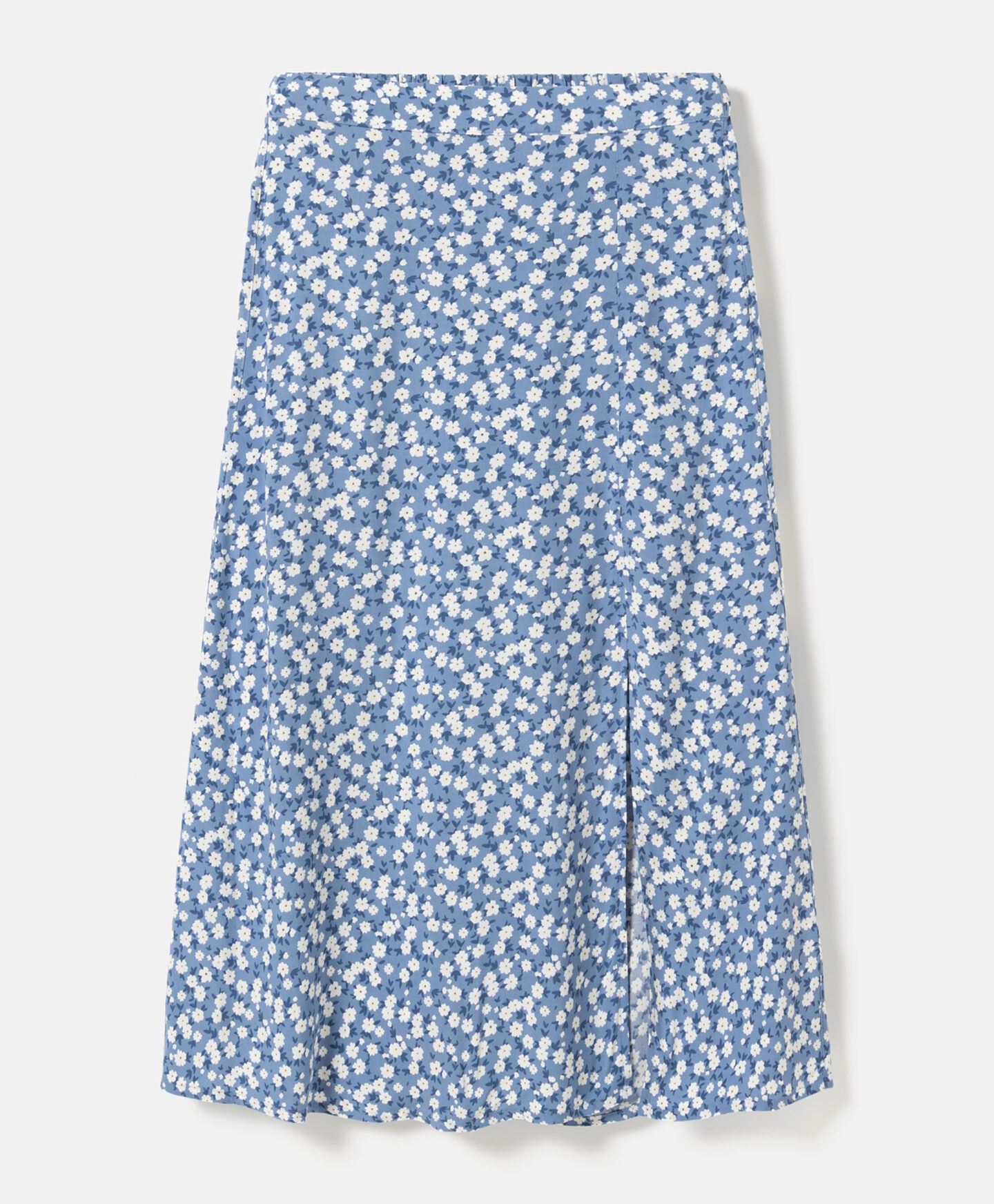 Suknja za žene s printom, od 100% viskoze, romantičan je dodatak ljetnoj garderobi. Plavo-bijeli uzorak inspirisan prirodom daje klasičan izgled. Lagani materijal lijepo pada, pruža osjećaj svježine i udobnosti tokom nošenja. Diskretan prorez dodatno naglašava siluetu i daje moderan završni detalj.
