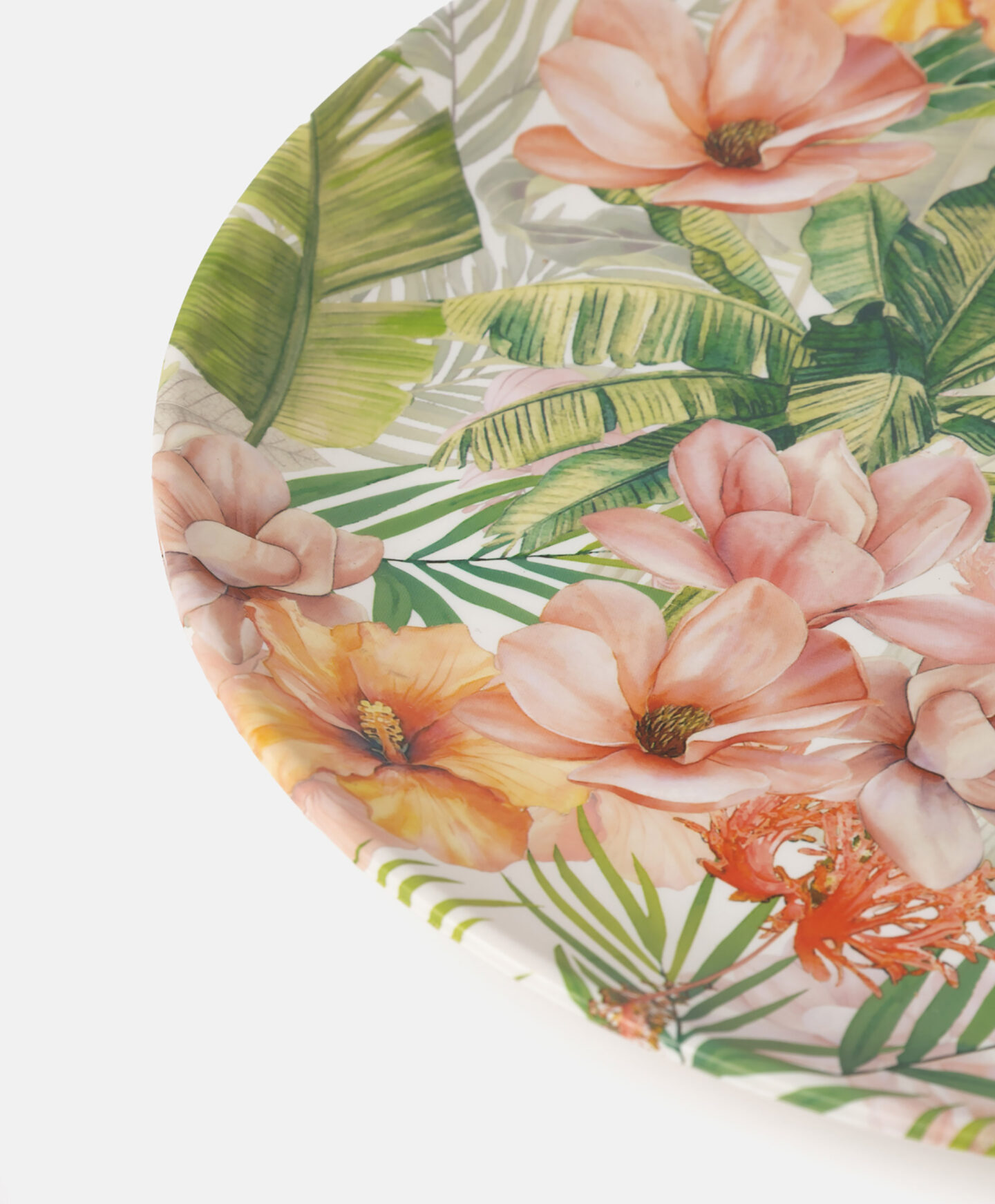 Tanjir za piknik s uzorkom cvijeta hibiskusa unosi egzotičan detalj na svaki stol. Savršeno se uklapa uz minimalističko bijelo posuđe kao akcent, ali i uz kompletan urbani džungla stil s bambus dodatcima i zelenim tekstilom.