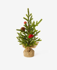 Umjetna jelka s dodatkom šišarki i crvenih bobica, u vreći od jute, ima poseban, svečani izgled. Zahvaljujući manjoj veličini, savršeno se uklapa u manje prostore – može se postaviti na sto, komodu ili radni sto. Spreman je ukras koji ne zahtijeva dodatne dekoracije.