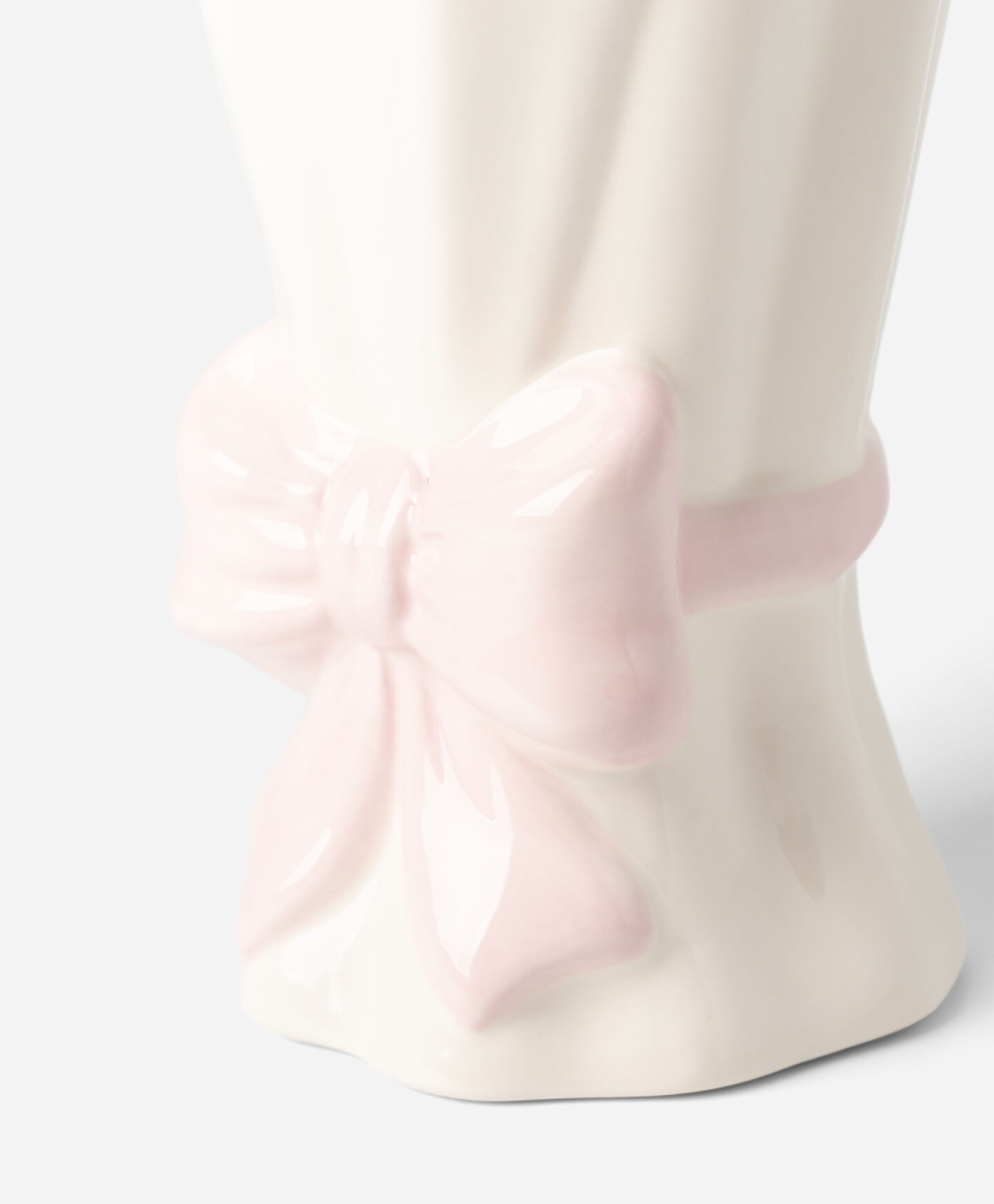 Keramička vaza s mašnom savršeno upotpunjuje dekor svakog interijera. Napravljena 100% od dolomita, odiše izdržljivošću i elegancijom. Ukrasni detalj mašne daje suptilan šarm i čini vazu pogodnom za klasične i moderne aranžmane. Idealna je za svježe cvijeće, suhe aranžmane ili kao samostalan ukras.
