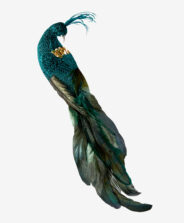 Veliki tirkizni paun upečatljiv je detalj koji će u potpunosti transformisati izgled jelke. Duga perja, koja svjetlucaju u bogatim paunovim tonovima, daju aranžmanu spektakularan karakter. Ovaj ukras odmah privlači pažnju, unoseći dašak egzotike i prazničnog glamura u prostor.