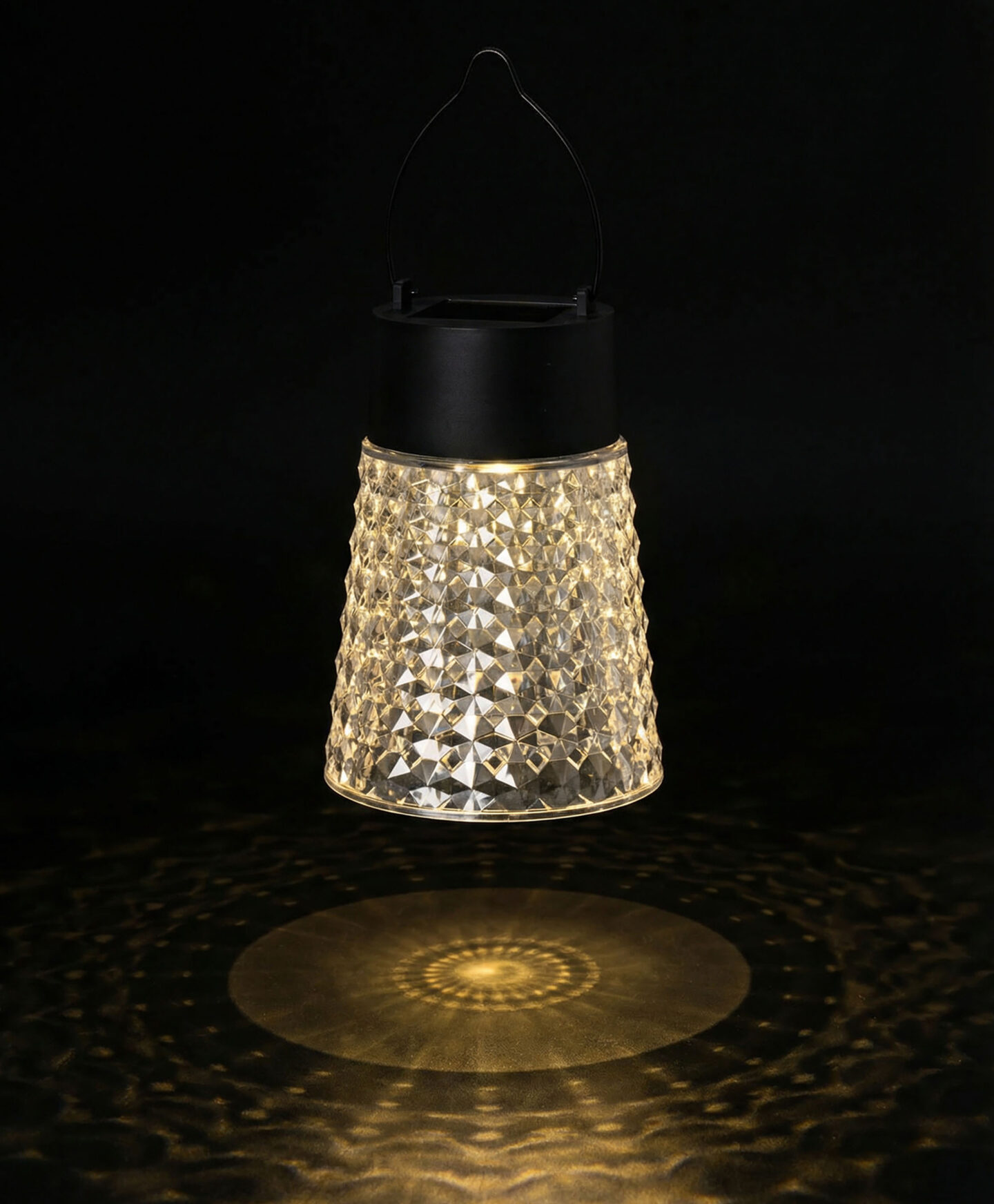 Viseća solarna lampa s kristalnim abažurom privlači pažnju svakog ljubitelja lijepih dodataka. Napajana solarnom energijom putem ugrađenog panela, radi bez kablova i baterija. Kristalni abažur raspršuje svjetlost na elegantan i umjetnički način. Opremljena je praktičnom ručkom koja omogućava kačenje na granu, šipku, ispod stropa ili na posebno postolje. Automatski se uključuje u sumrak i isključuje u zoru, pružajući osvjetljenje bez održavanja tokom cijele noći.
