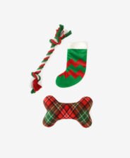 Zeleni poklon set za kućne ljubimce sadrži igračke koje podstiču kretanje i igru. Pleteno uže savršeno je za povlačenje, dok je mekana kost s kariranom šarom pogodna za žvakanje. Ovo je prijedlog za prazničnu zabavu koja okupira psa i ispunjava vrijeme veselom energijom.