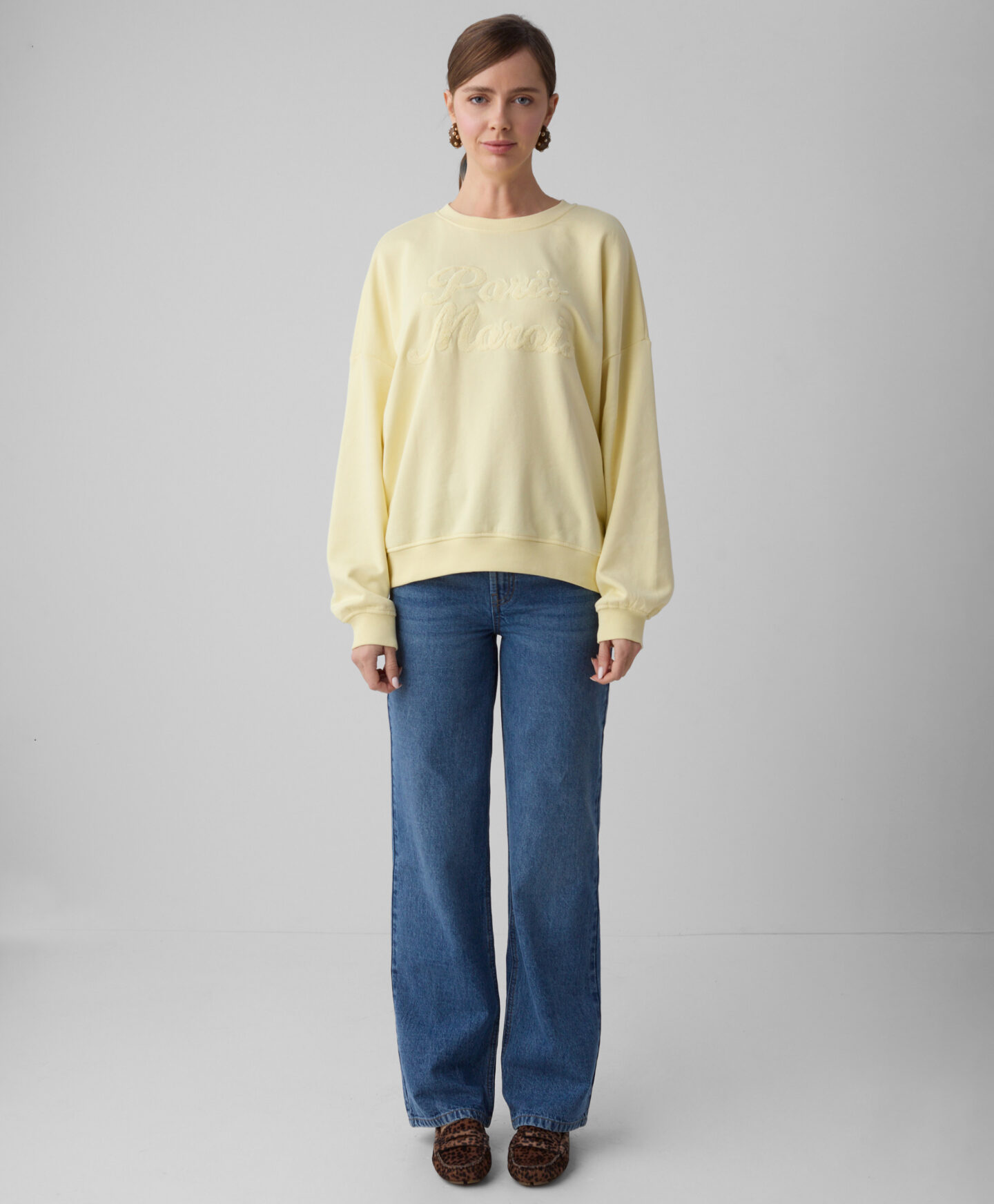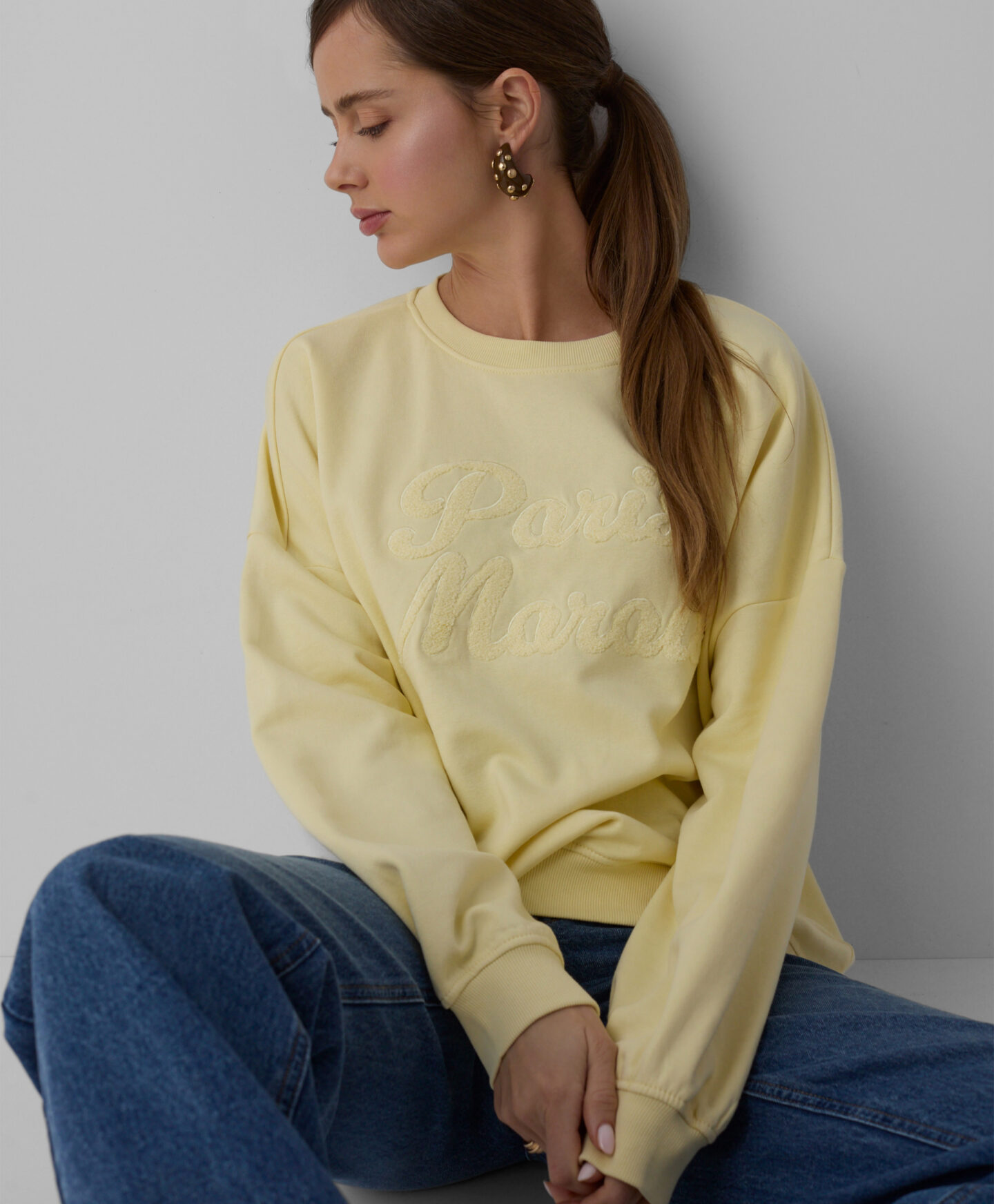 Žuti džemper s aplikacijom i visokim udjelom pamuka za žene, izuzetno je mekan, prozračan i prijatan na dodir. Prikladan je za svako godišnje doba, pružajući udobnost i slobodu kretanja. Ukrasna aplikacija sprijeda daje mu jedinstven karakter.