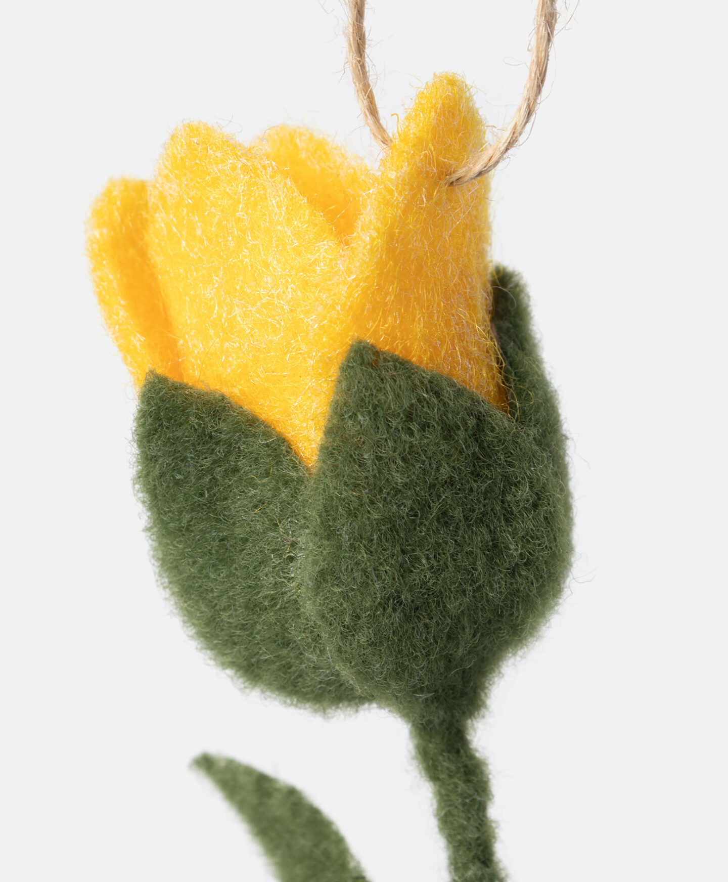 Žuti privjesak od filca u obliku tulipana uljepšat će svaki proljetni aranžman. Objesite ga na grančice postavljene u vazu i oduševite sve u domu. Materijal od filca ugodan je na dodir i unosi toplinu u prostor. Privjesak je također odlična ideja za poklon za one koji cijene cvjetne motive.