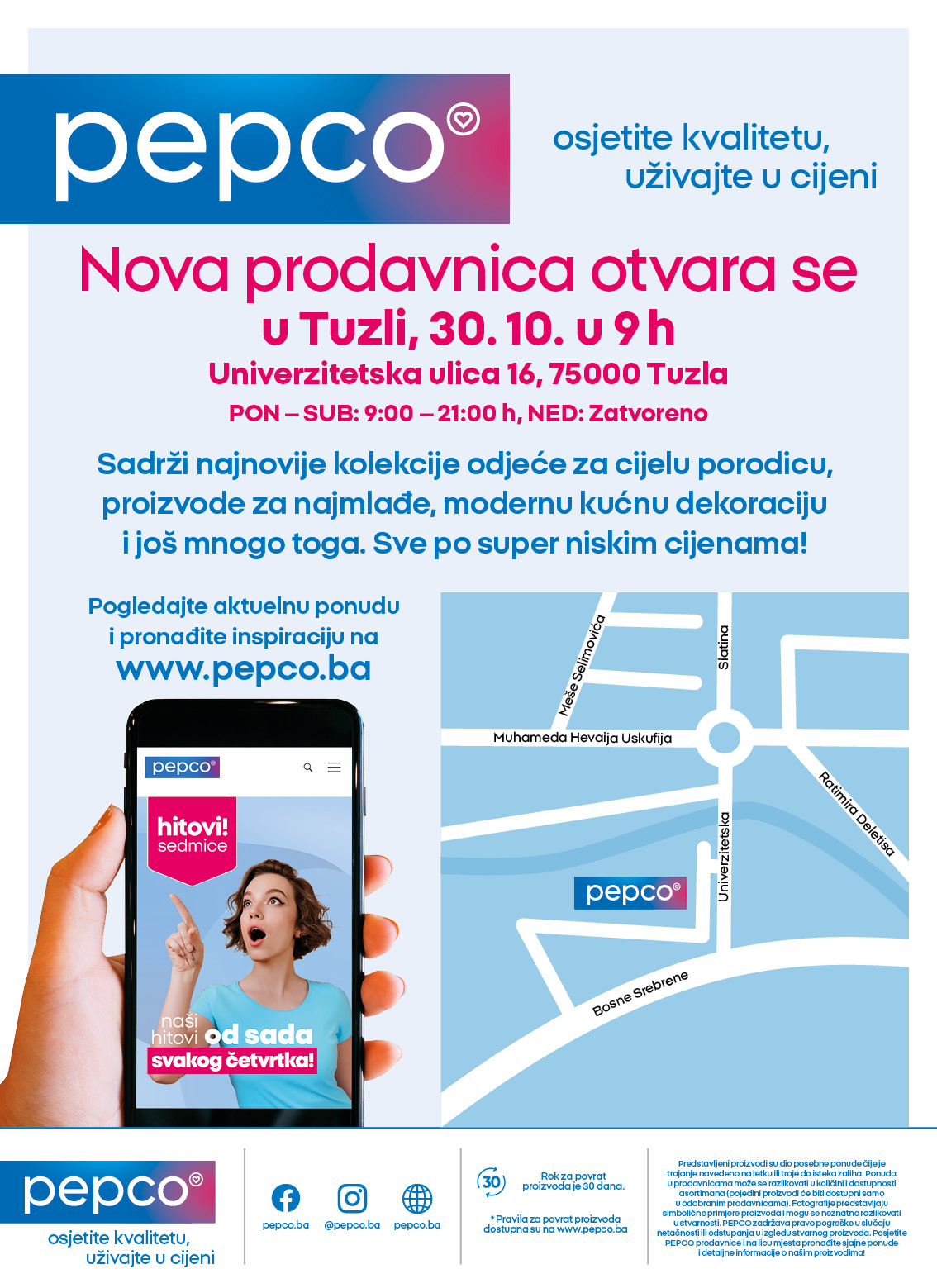 Kod nas ćete pronaći širok izbor proizvoda za djecu i odrasle. U ponudi imamo modernu odjeću za sve generacije – od jeansa i elegantnih haljina do udobnih majica. Bogata kolekcija igračaka izmamit će osmijeh na lice svakom djetetu, dok će unikatni ukrasi unijeti poseban karakter i toplinu u vaš dom. Ali Pepco nije samo moda i dekoracije! U našoj prodavnici Pepco Hasana Merdžanovića 1, Vogošća očekuju vas i praktična rješenja za svaki dom – funkcionalni artikli za organizaciju prostora, kao i korisni kuhinjski i kupatilski dodaci. Sve to po izuzetno povoljnim cijenama.